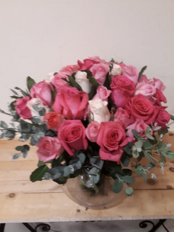 40 pink and foushia roses in a vase
