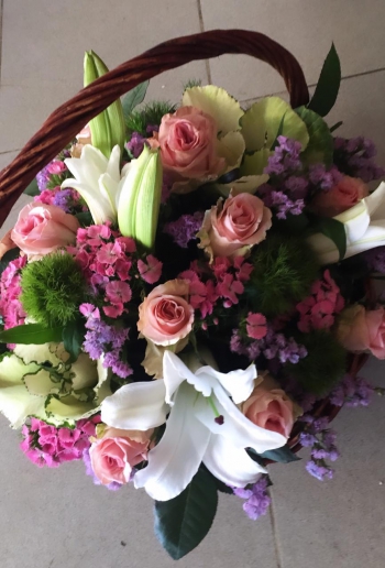 mix pink flowers in a basket included